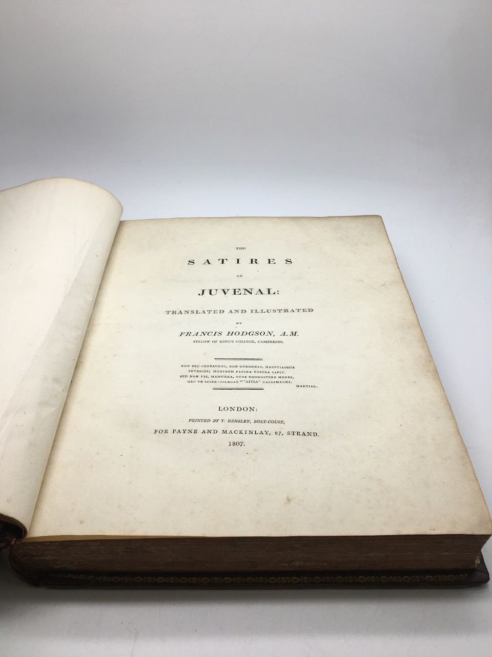 London,, 1807. Binding sensitively rebacked and restored, although one of the raised bands has been mostly chipped off. Later front and rear marbled endpapers and reinforcement to hinges.. [8], xxxix, [1], 572pp. 4to. English version of Juvenal's fifteen satires, with extensive endnotes, by the Cambridge scholar and lifelong friend and correspondent of Byron. Byron features in the preliminary list of subscribers. Presentation inscription from Eton schoolmaster E C Hawtrey (according to the list five copies were printed for a presumed kinsman Rev Stephen Hawtrey) to Egerton Leigh (1815-76) whose armorial bookplate is on the pastedown. The occasion of the presentation was the recipient's leaving Eton ('ab Etona discedenti') in 1830. In the following decades Francis Hodgson and E C Hawtrey served consecutively as provost of the school. Contemporary full calf, decorative gilt borders to both panels, spine lettered gilt and decorated gilt in compartments and on raised bands.